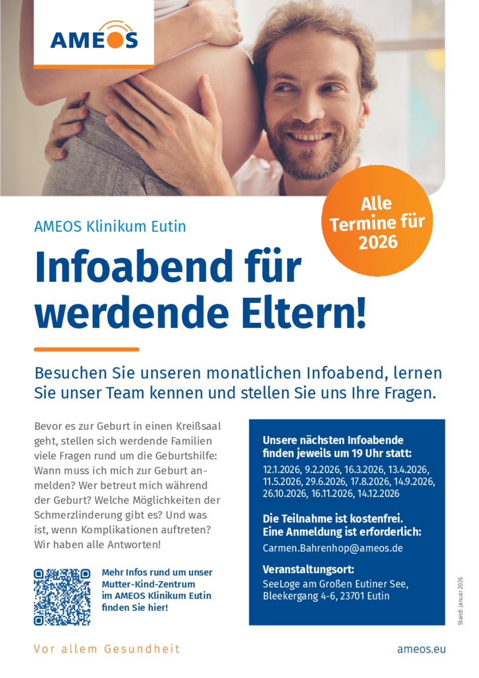 Anmeldung per Telefon oder E-Mail erforderlich bei Carmen Bahrenhop: 04521 787 2183 oder Carmen.Bahrenhop@ameos.de.