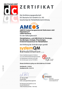 ZERTIFIKAT Die Zertifizierungsgesellschaft DC Deutsche Cert GmbH & Co. KG bescheinigt der Rehabilitationseinrichtung AMEOS Krankenhausgesellschaft Südholstein mbH Röpersberg 47 23909 Ratzeburg für…